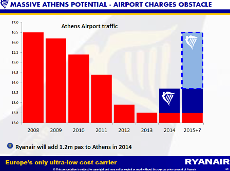 Σύμφωνα με εκτιμήσεις τις αεροπορικής εταιρείας, η Ryanair θα φέρει στην Αθήνα 1,2 εκατ. επιβάτες το 2014, ενώ αναμένει αύξηση αυτού του αριθμού για το 2015, όπως δείχνει και το παρακάτω διάγραμμα.