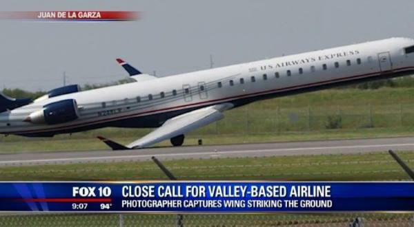 planeΣοκαριστικές σκηνές διαδραματίστηκαν με 90 επιβάτες της US Airways Express στο αεροδρόμιο McAllen Miller, κοντά στα σύνορα του Τέξας με το Μεξικό, όταν το αεροπλάνο στο οποίο επέβαιναν προσέκρουσε με το δεξί φτερό στον διάδρομο.