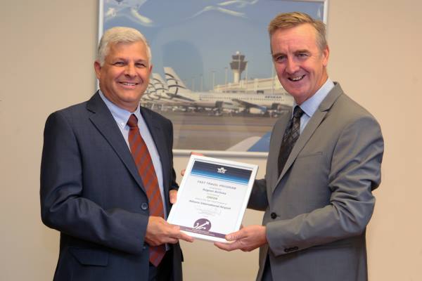 Ο κ. Πάνος Νικολαΐδης, Διευθυντής Υπηρεσιών Εδάφους της AEGEAN και της Olympic Air παραλαμβάνει από τον κ. Mike Higgins, European Regional Director of the Airport, Passenger Cargo and Security division ΙΑΤΑ το Green award του Fast Travel Program.