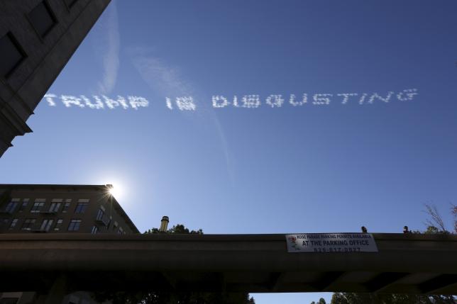 Πέντε αεροπλάνα πέταξαν για σχεδόν μία ώρα πάνω από την ετήσια παρέλαση των ρόδων στην Πασαντίνα στην Καλιφόρνια, σχηματίζοντας με τις άσπρες γραμμές που δημιουργούνται πίσω από τα αεροπλάνα φράσεις στον ουρανό που έλεγαν: “Η Αμερική είναι υπέροχη. Ο Τραμπ είναι αηδιαστικός. Οποιοσδήπτε εκτός από τον Τραμπ”.