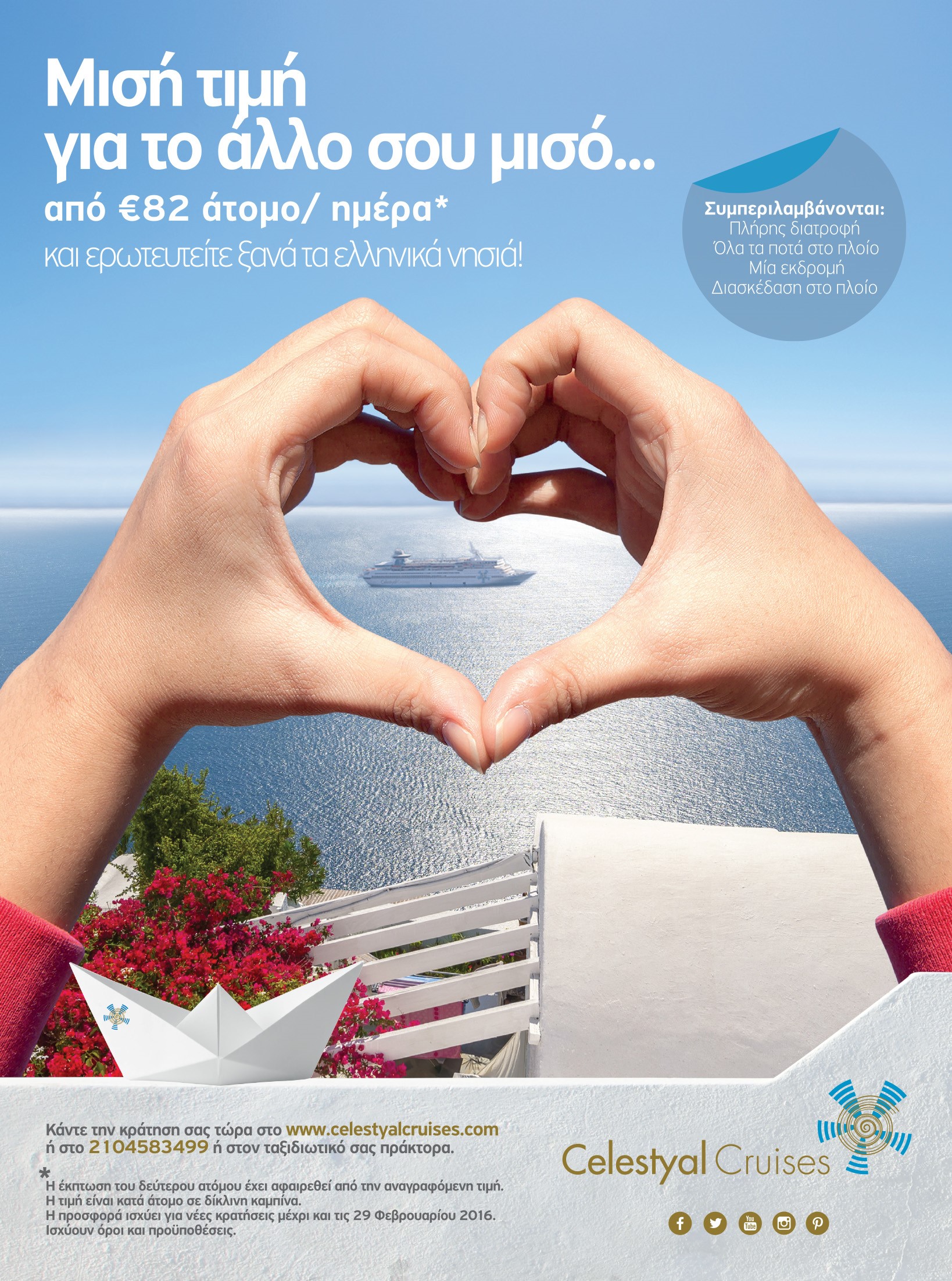 Σε μια καμπάνια γεμάτη αγάπη, η Celestyal Cruises σας κάνει δώρο τη μισή τιμή για το άλλο σας μισό! Έτσι, σε όλες τις νέες κρατήσεις, μέσα στο Φεβρουάριο, οι επιβάτες θα έχουν την ευκαιρία να επισκεφτούν μοναδικούς προορισμούς σε όλο το Αιγαίο, απολαμβάνοντας πλήρη διατροφή, πακέτο ποτών, μια εκδρομή καθώς και διασκέδαση στο κρουαζιερόπλοιο, από μόλις 82€ την ημέρα το άτομο. Αγοράζοντας λοιπόν εισιτήρια μέχρι τις 29 Φεβρουαρίου μπορεί κάποιος να επωφεληθεί της προσφοράς και να κερδίσει 50% έκπτωση στο δεύτερο άτομο!