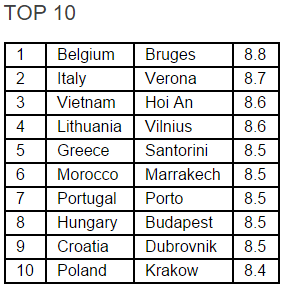 Ως κορυφαίος προορισμός αναδεικνύεται η μεσαιωνική πόλη Μπρυζ του Βελγίου, με εικόνες που παραπέμπουν σε παραμύθι, συγκεντρώνοντας βαθμολογία 8,8.