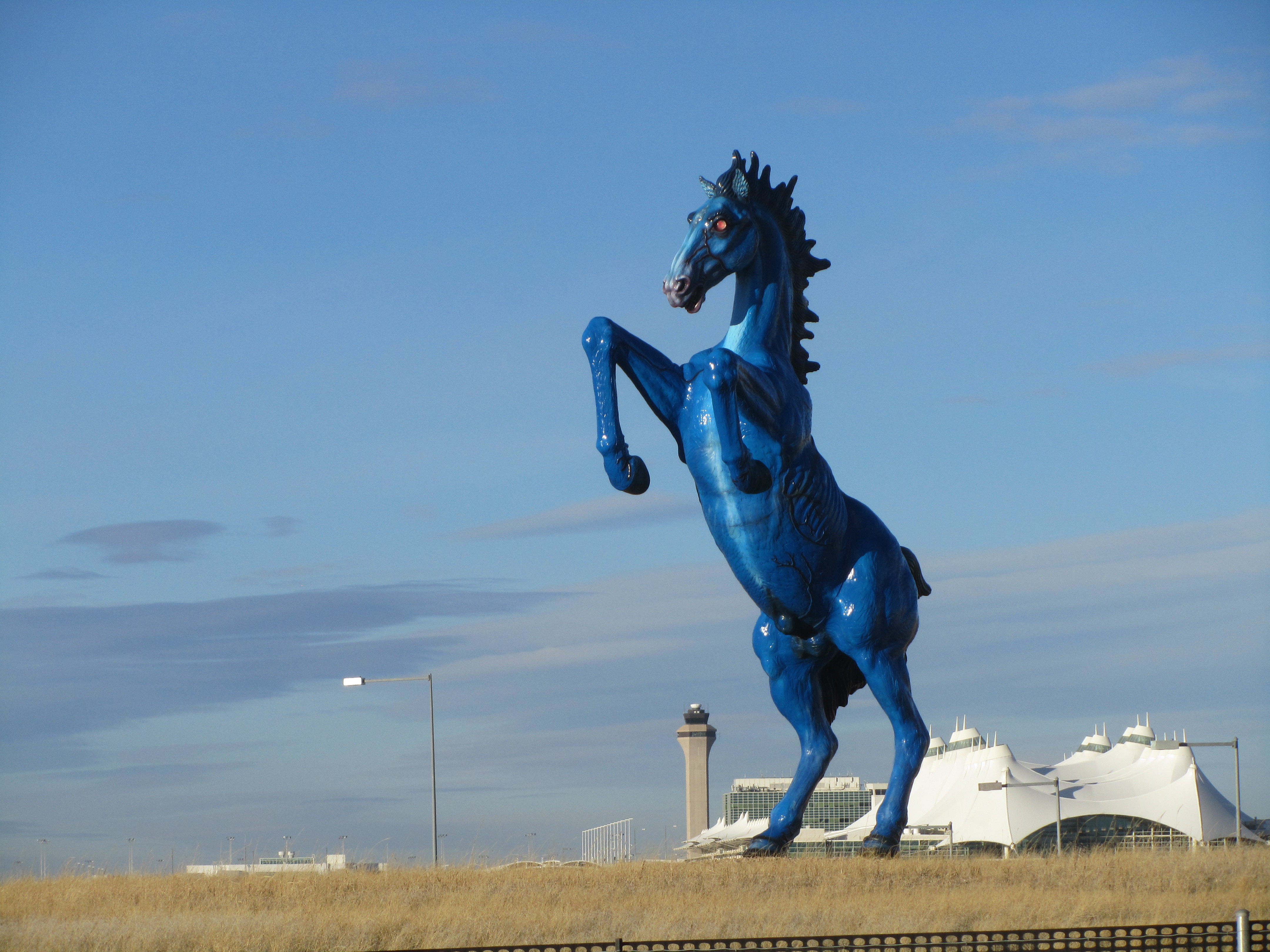 Κάτι πραγματικά ανατριχιαστικό είναι το μπλε άγαλμα ενός αλόγου έξω από το ίδιο το αεροδρόμιο. Ο τίτλος του είναι Mustang, αλλά το παρατσούκλι που του έχουν δώσει οι συνωμοσιολόγοι είναι “Blucifer”! Είναι περίπου 10 μέτρα ψηλό και ζυγίζει πάνω από 4 τόνους. Τα μάτια του λάμπουν όλες τις ώρες της ημέρας και της νύχτας, προκαλώντας κάποιους να εικάζουν ότι το άγαλμα έχει ως στόχο να εκπροσωπεί τον τέταρτο Καβαλάρη της Αποκάλυψης, o οποίος αντιπροσωπεύει τον Θάνατο. Ο καλλιτέχνης του αγάλματος, Luis Jiménez σκοτώθηκε από το ίδιο το άγαλμα. Το 2006, λίγο πριν το ολοκληρώσει, ένα κομμάτι από το άγαλμα έπεσε πάνω του και τον σκότωσε.