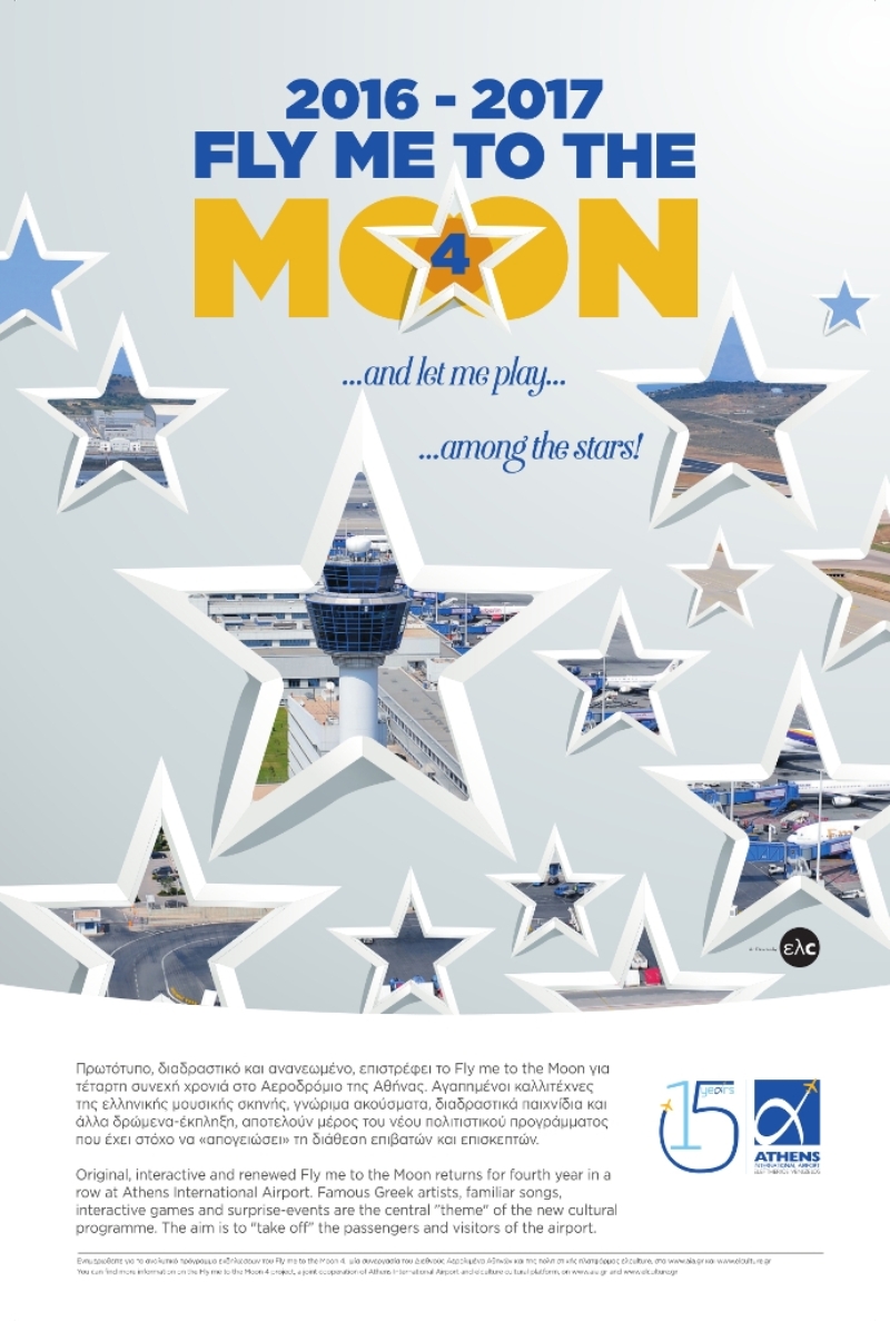 Για τέταρτη συνεχή χρονιά συνεχίζονται οι πτήσεις μέχρι… το φεγγάρι για το κοινό και τους επιβάτες στο αεροδρόμιο της Αθήνας, με ένα ψυχαγωγικό πρόγραμμα που μεταμορφώνει τον αεροσταθμό, άλλοτε σε μουσική ή χορευτική σκηνή, αλλά και σε θεατρικό σκηνικό ή ακόμη και σε πίστα για γιγαντιαίο σκάκι!