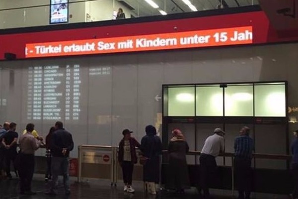 “Η Τουρκία επιτρέπει τις σεξουαλικές πράξεις με παιδιά ηλικίας, κάτω των 15 ετών,” έγραφε τίτλος είδησης σε μπάρα ηλεκτρονικών ειδήσεων στο αεροδρόμιο, σύμφωνα με φωτογραφίες που έκαναν τον γύρο των μέσων κοινωνικής δικτύωσης.