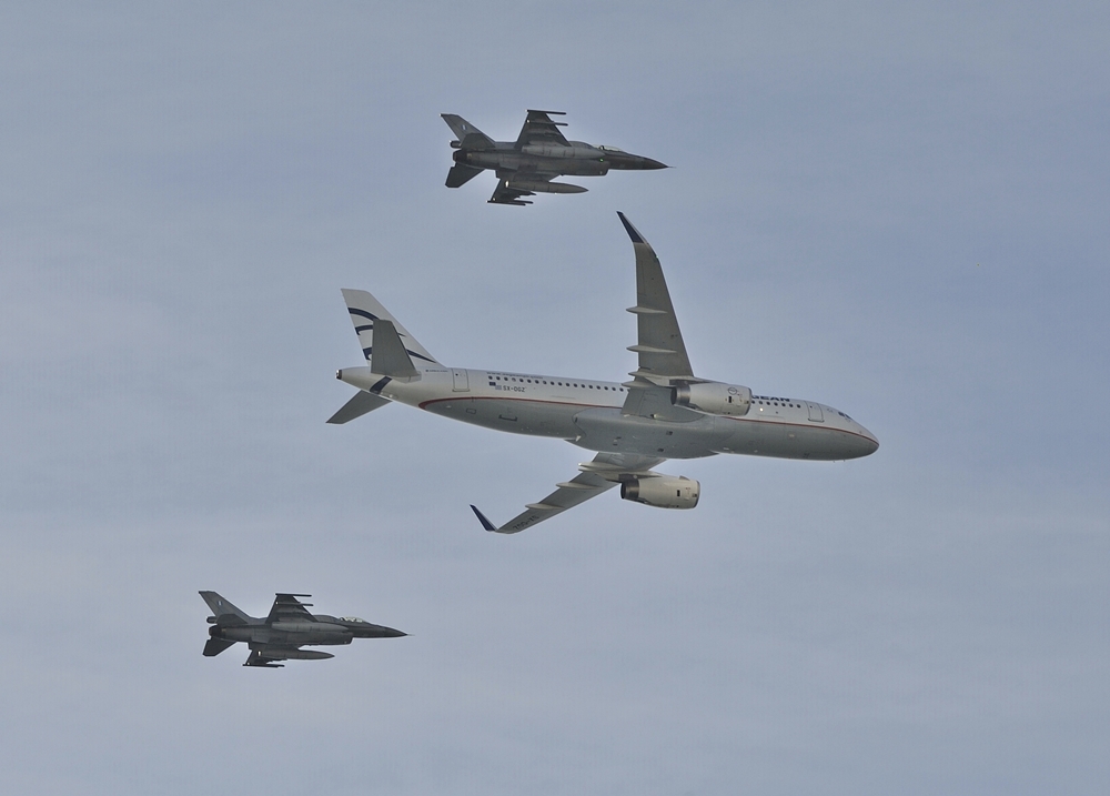 Οι επιδείξεις ολοκληρώθηκαν με την εντυπωσιακή διέλευση σε σχηματισμό της Ομάδας Αεροπορικών Επιδείξεων Μεμονωμένου Αεροσκάφους F-16 «Ζευς» με το αεροσκάφος της AEGEAN Airbus A320ceo.