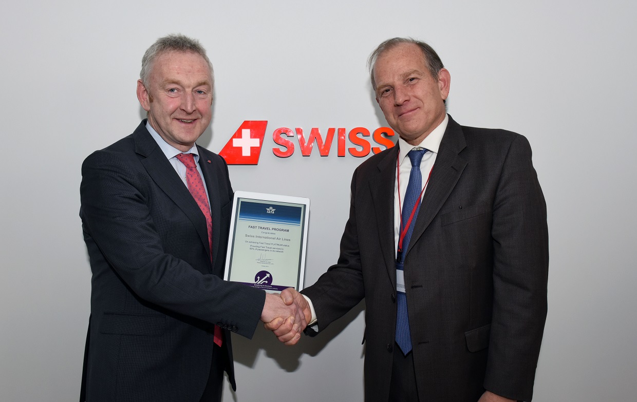 H SWISS τιμήθηκε από τη Διεθνή Ένωση Αεροπορικών Μεταφορών (IATA) με το βραβείο Fast Travel Award Platinum για τη μεγάλη ποικιλία των καινοτόμων self-service εγκαταστάσεων της. Το πλατινένιο βραβείο στο πρόγραμμα Fast Travel της ΙΑΤΑ απονέμεται μόνο στις αεροπορικές εταιρείες που προσφέρουν self-service τουλάχιστον στο 80% των επιβατών τους, όπως ορίζεται από την κεντρική ένωση της αεροπορικής βιομηχανίας, όπως τα online check-in. Ο Διευθύνων Σύμβουλος της SWISS Thomas Klühr έλαβε την αναγνωρισμένου κύρους διάκριση από την ΙΑΤΑ την Τρίτη σε μια τελετή που πραγματοποιήθηκε στα κεντρικά γραφεία της SWISS. Η SWISS υπήρξε ενεργό μέλος του προγράμματος της ΙΑΤΑ Fast Travel από τότε που ξεκίνησε το 2007.