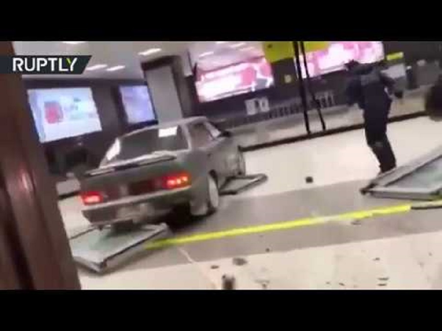 Το περιστατικό συνέβη το βράδυ της Τετάρτης, ενώ στο βίντεο διακρίνεται το Lada Samara να πέφτει τέσσερις φορές πάνω στη γυάλινη πόρτα του αεροδρομίου, προτού καταφέρει να μπουκάρει στο κτίριο με τους αστυνομικούς να προσπαθούν να τον σταματήσουν.