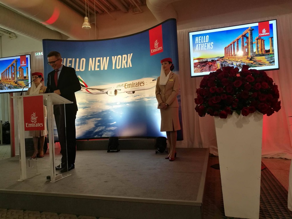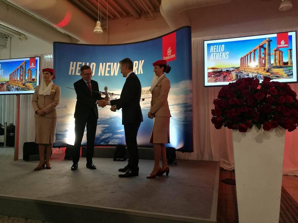 Την εναρκτήρια πτήση Ντουμπάι – Αθήνα – Νέα Υόρκη, που πραγματοποιήθηκε από αεροσκάφος τύπου B777-300ER, υποδέχτηκε επίσημη αντιπροσωπεία στον Διεθνή Αερολιμένα Αθηνών, αποτελούμενη από τους κ.κ. Γιάννη Παράσχη-CEO του Διεθνούς Αερολιμένα Αθηνών, Hubert Frach – Divisional Senior Vice President Commercial Operations West της Emirates και Ευρυδίκη Κουρνέτα, Γενική Γραμματέα Υπουργείου Τουρισμού.