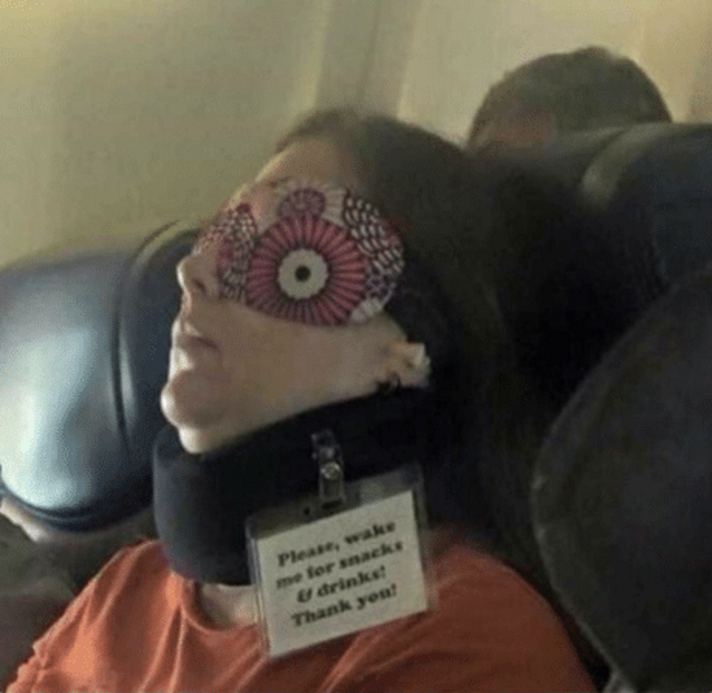 Φορώντας τη μάσκα ύπνου της και το ανατομικό της κολάρο, αποκοιμήθηκε, αφού πρώτα κρέμασε ένα ταμπελάκι, δίνοντας κάποιες “οδηγίες” στους συνεπιβάτες και το προσωπικό!