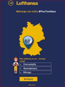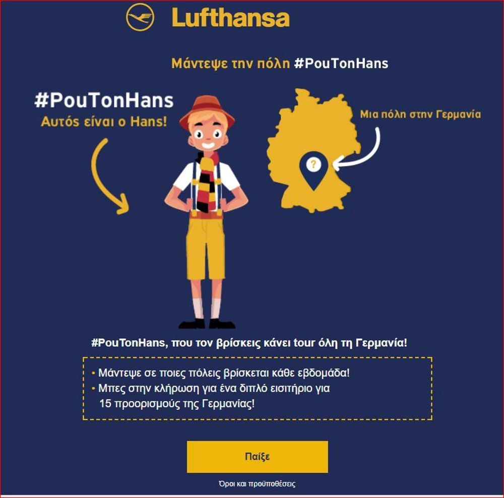 Οι επιβάτες που βρίσκονται στον Διεθνή Αερολιμένα Αθηνών μπορούν επίσης να πάρουν μέρος στον διαγωνισμό #PouTonHans στο ειδικά διαμορφωμένο περίπτερο της Lufthansa στον χώρο του αεροδρομίου.