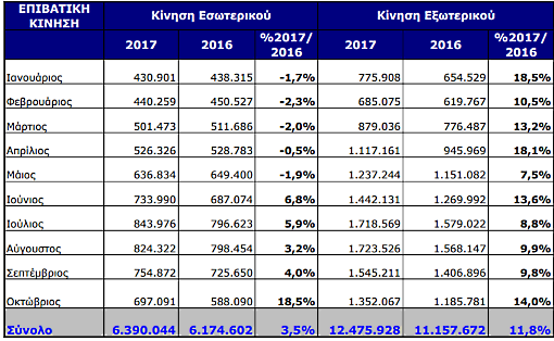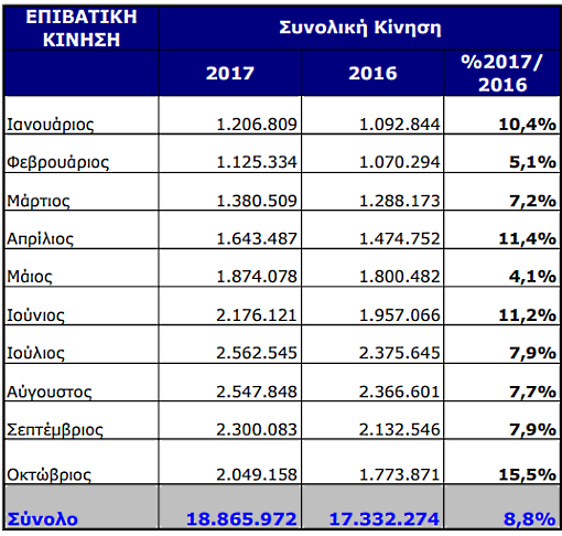 Η αύξηση οφείλεται στην άνοδο τόσο της κίνησης εσωτερικού (+18,5%) όσο και της κίνησης εξωτερικού (+14%). Συνολικά, κατά την περίοδο Ιανουαρίου-Οκτωβρίου του 2017, η κίνηση του αεροδρομίου έφθασε τους 18,9 εκατ. επιβάτες, σημειώνοντας άνοδο της τάξης του 8,8%. Η άνοδος αυτή οφείλεται στην άνοδο της διεθνούς κίνησης κατά 11,8% και της κίνησης εσωτερικού κατά 3,5%.