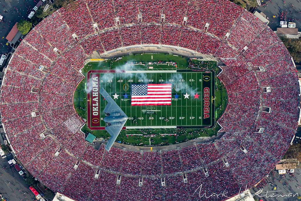 Ο φωτογράφος, που ειδικεύεται στις λήψεις από αέρος, πετώντας με Τσέσνα 2016, κατάφερε να απαθανατίσει πολεμικό αεροσκάφος Stealth Bomber (το λεγόμενο αόρατο από τα εχθρικά ραντάρ) το οποίο πετούσε πάνω από το γήπεδο της Pasadena στην Καλιφόρνια, κατά τη διάρκεια της αναμέτρησης του Rose Bowl 2018 ανάμεσα στους Oklahoma Sooners και τους Georgia Bulldogs.
