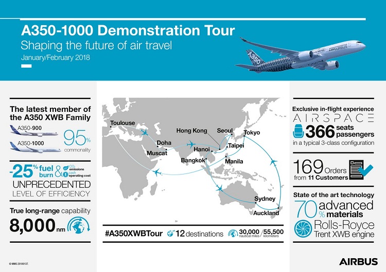 Κατά τη διάρκεια της περιοδείας, το αεροσκάφος ελέγχου πτήσης A350-1000 (MSN065) θα επισκεφθεί 12 προορισμούς, για να αναδείξει τις αποκλειστικές λειτουργίες του στις αεροπορικές εταιρείες. Το δρομολόγιο θα ταξιδέψει πάνω από 30.000 ναυτικά μίλια/ 55.500 χιλιόμετρα, με στάσεις στη Ντόχα, το Μουσκάτ, το Χονγκ Κονγκ, τη Σεούλ, την Ταϊπέι, το Ανόι, τη Σιγκαπούρη, την Μπανγκόκ, το Σίδνεϊ, το Όκλαντ, το Τόκιο και τη Μανίλα.