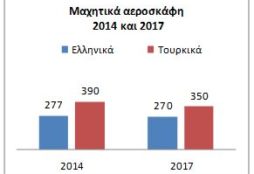 Μαχητικά Αεροσκάφη: Τα μαχητικά αεροσκάφη της Ελληνικής Πολεμικής Αεροπορίας το 2017 είναι μειωμένα. Σήμερα ανέρχονται στα 270 σε σχέση με 277 το 2014 και 283 το 2004. Ακόμη πιο αισθητή είναι η μείωση στην τουρκική πλευρά, όπου τα μαχητικά αεροσκάφη ανέρχονται στα 360 σε σχέση με 390 το 2014 και 445 το 2004.
