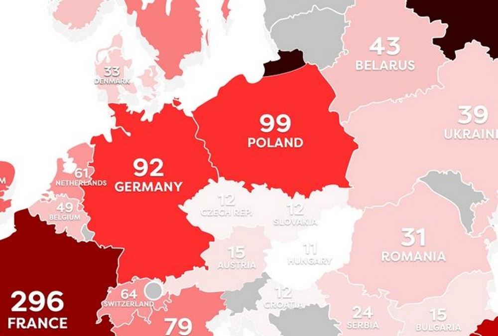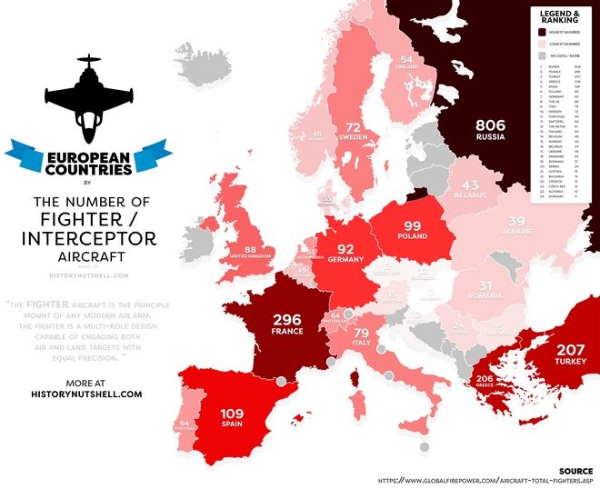 Χαρακτηριστική απόδειξη η νίκη των Ισραηλινών στην ενάντια των ενωμένων αραβικών δυνάμεων στον πόλεμο των 6 ημερών πριν από 51 χρόνια. Σύμφωνα με τα στοιχεία του globalfirepower.com που διαμόρφωσε σε χάρτη το historynutshell.com αναμφισβήτητη υπερδύναμη της πολεμικής αεροπορίας στην Γηραιά ήπειρο είναι η Ρωσία η οποία διαθέτει 806 μαχητικά, περίπου όσα διαθέτουν μαζί οι τέσσερις χώρες που την ακολουθούν στην λίστα.