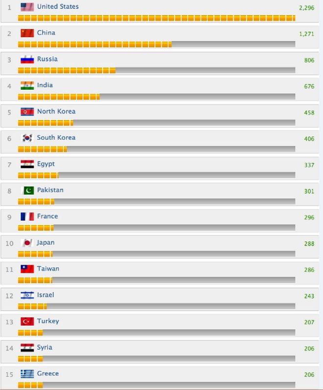 Αν και τα στοιχεία το historynutshell αναφέρει ότι τα στοιχεία του είναι του 2017 αυτά διαφέρουν σημαντικά (τουλάχιστον σε ότι αφορά την Ελλάδα και την Τουρκία) από αυτά του Κυπριακού Κέντρου Στρατηγικών Μελετών για την ίδια χρονιά. Σε παγκόσμιο επίπεδο η Ελλάδα είναι η 15η δύναμη.