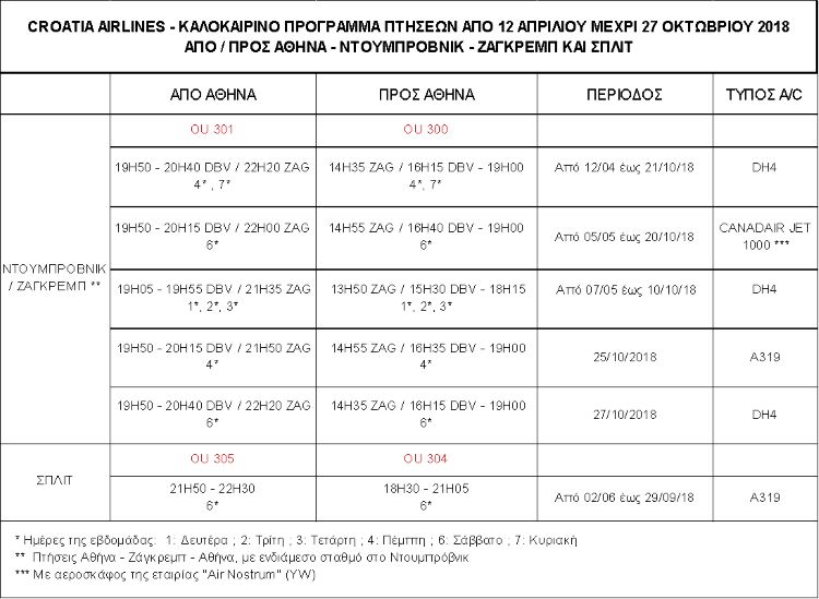 Για τη θερινή περίοδο και συγκεκριμένα από τις 12 Απριλίου, η Croatia Airlines ξεκινάει για άλλη μια χρονιά τις πτήσεις της για την Αθήνα, που θα έχουν διάρκεια ως τις 27 Οκτωβρίου 2018, ενισχύοντας σταδιακά τα δρομολόγιά της και φτάνοντας στα επτά εβδομαδιαίως. Από τις 12 Απριλίου θα συνδέει την Αθήνα με το Ντουμπρόβνικ και το Ζάγκρεμπ καθημερινά εκτός Παρασκευής και από τις 2 Ιουνίου θα αναχωρεί απευθείας πτήση από την Αθήνα προς το Σπλιτ κάθε Σάββατο.