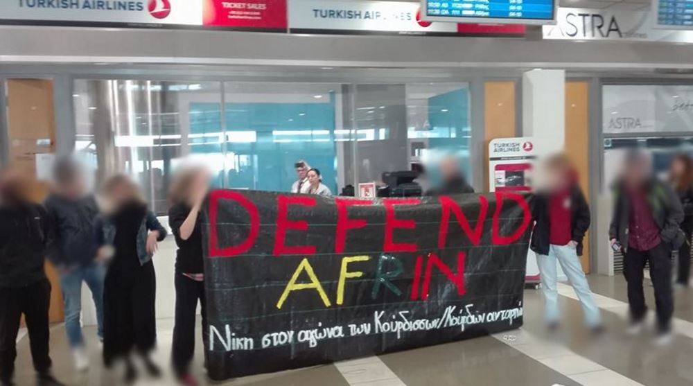 Συμβολική διαμαρτυρία στα γκισέ της Turkish Airlines στο αεροδρόμιο Μακεδονία πραγματοποίησαν σήμερα το πρωί 19 Μαρτίου, μέλη της Πρωτοβουλίας αλληλεγγύης στο Αφρίν και της Ελευθεριακής Πρωτοβουλίας Θεσσαλονίκης.