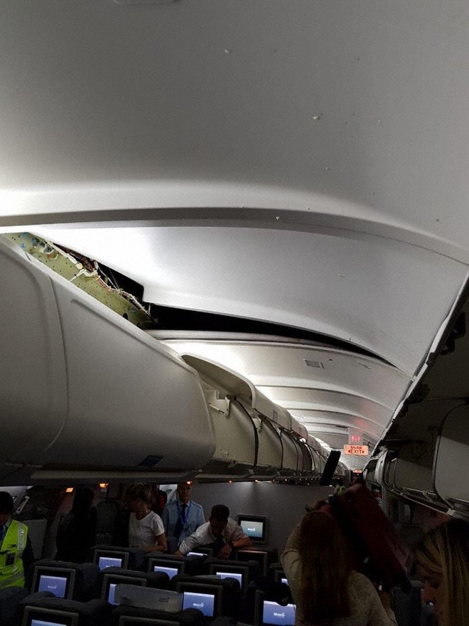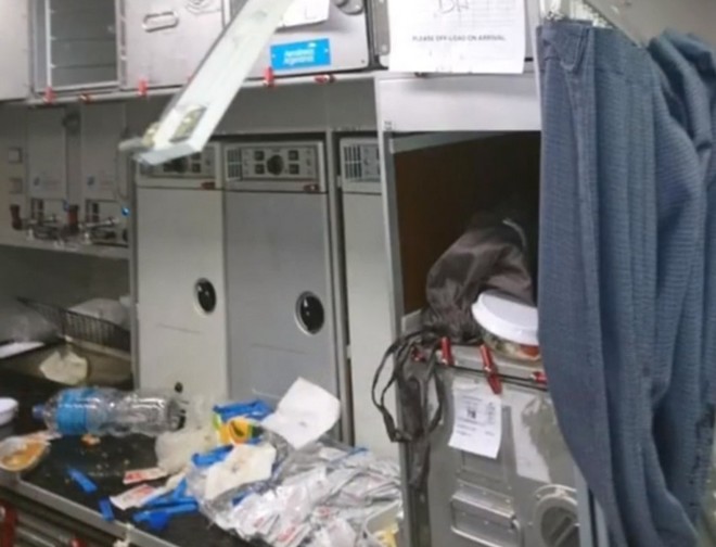 Στις εικόνες φαίνονται τα φαγητά να είναι στο πάτωμα, οι μάσκες οξυγόνου να έχουν πέσει και οι κουρτίνες να είναι πεσμένες κάτω.