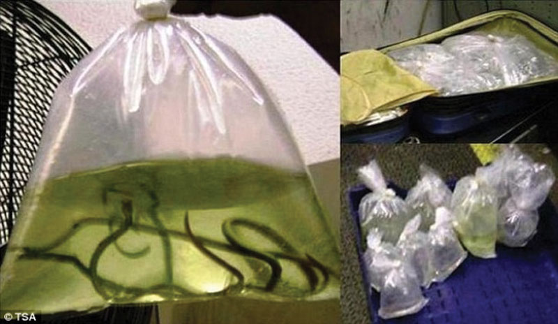 Στο αεροδρόμιο της Ατλάντα, κατά τον έλεγχο, βρέθηκε ένας μεγάλος αριθμός νεκρών φιδιών, τα οποία διατηρούνταν μέσα σε βάζα. Αυτό δεν είναι παράνομο αν υπάρχουν τα απαραίτητα χαρτιά. Ομως ο συγκεκριμένος επιβάτης δεν είχε ενημερώσει και έτσι βρέθηκε να απολογείται στον έλεγχο.