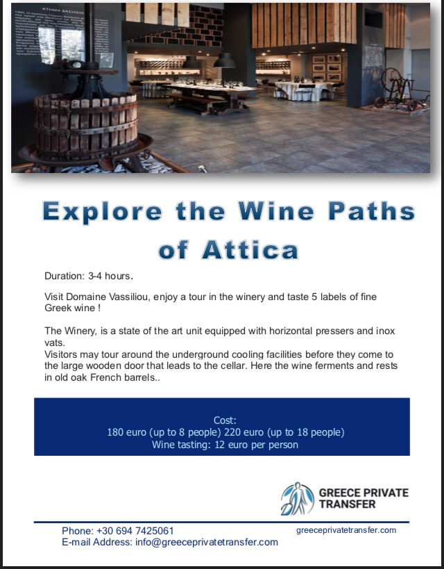Γνωρίστε τα πάντα γύρω από το οίνο, γευτείτε πέντε από τα καλύτερα ελληνικά κρασιά και όλα αυτά με την πολυτέλεια που προσφέρουν τα οχήματα, οι υπηρεσίες και οι οδηγοί της εταιρείας Greece Private Transfer.