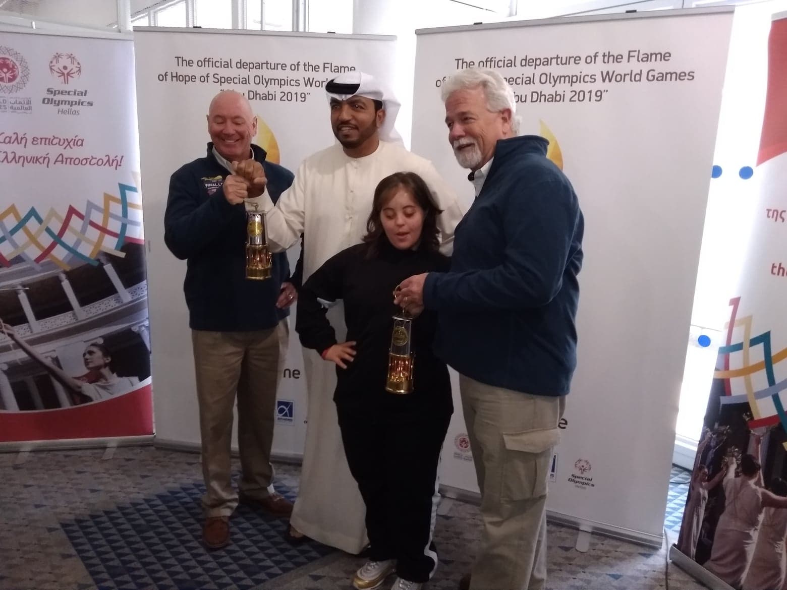 Η Etihad Airways, επίσημος αερομεταφορέας των Παγκόσμιων Αγώνων Special Olympics Abu Dhabi 2019, μετέφερε την Φλόγα της Ελπίδας από την Αθήνα στην πρωτεύουσα των Ηνωμένων Αραβικών Εμιράτων. Η φλόγα μεταφέρθηκε την Πέμπτη σε ένα ειδικά σχεδιασμένο κιβώτιο με αεροσκάφος Boeing 787-9, το οποίο ήταν διακοσμημένο με τα νέα διακριτικά για τα Special Olympics. Κυβερνήτες του αεροσκάφους ήταν οι Fouad Almarzouqi από τα ΗΑΕ και ο Έλληνας Σπυρίδων Νάκος.