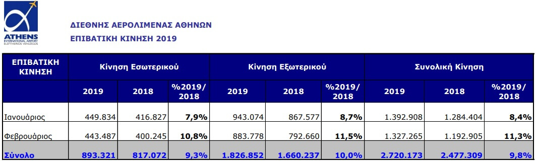 Η επιβατική κίνηση του αεροδρομίου της Αθήνας το Φεβρουάριο του 2019 έφτασε τους 1.327.265 επιβάτες, σημειώνοντας έτσι αύξηση 11,3%.