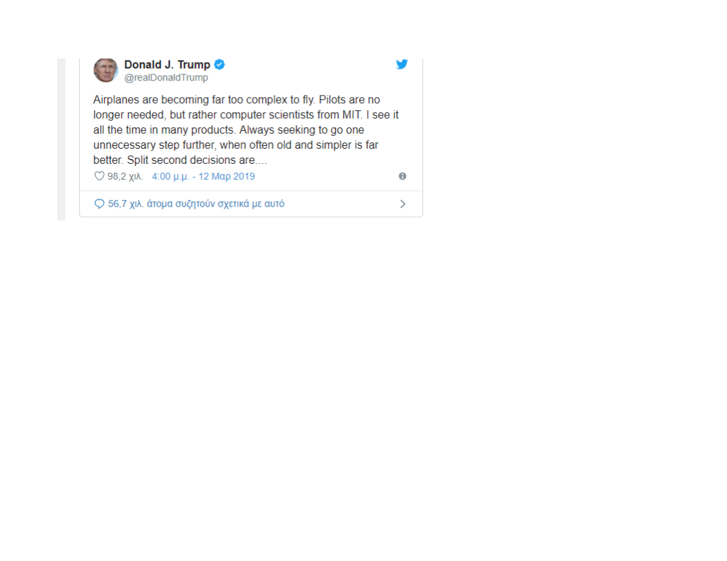 Ο πρόεδρος των Ηνωμένων Πολιτειών Αμερικής Ντόναλντ Τραμπ εξέφρασε τη λύπη του που τα αεροπλάνα έχουν γίνει «υπερβολικά περίπλοκα για να κυβερνηθούν», δύο ημέρες μετά τη συντριβή ενός Boeing737 MAX των Αιθιοπικών Αερογραμμών που κόστισε τη ζωή σε 157 ανθρώπους.