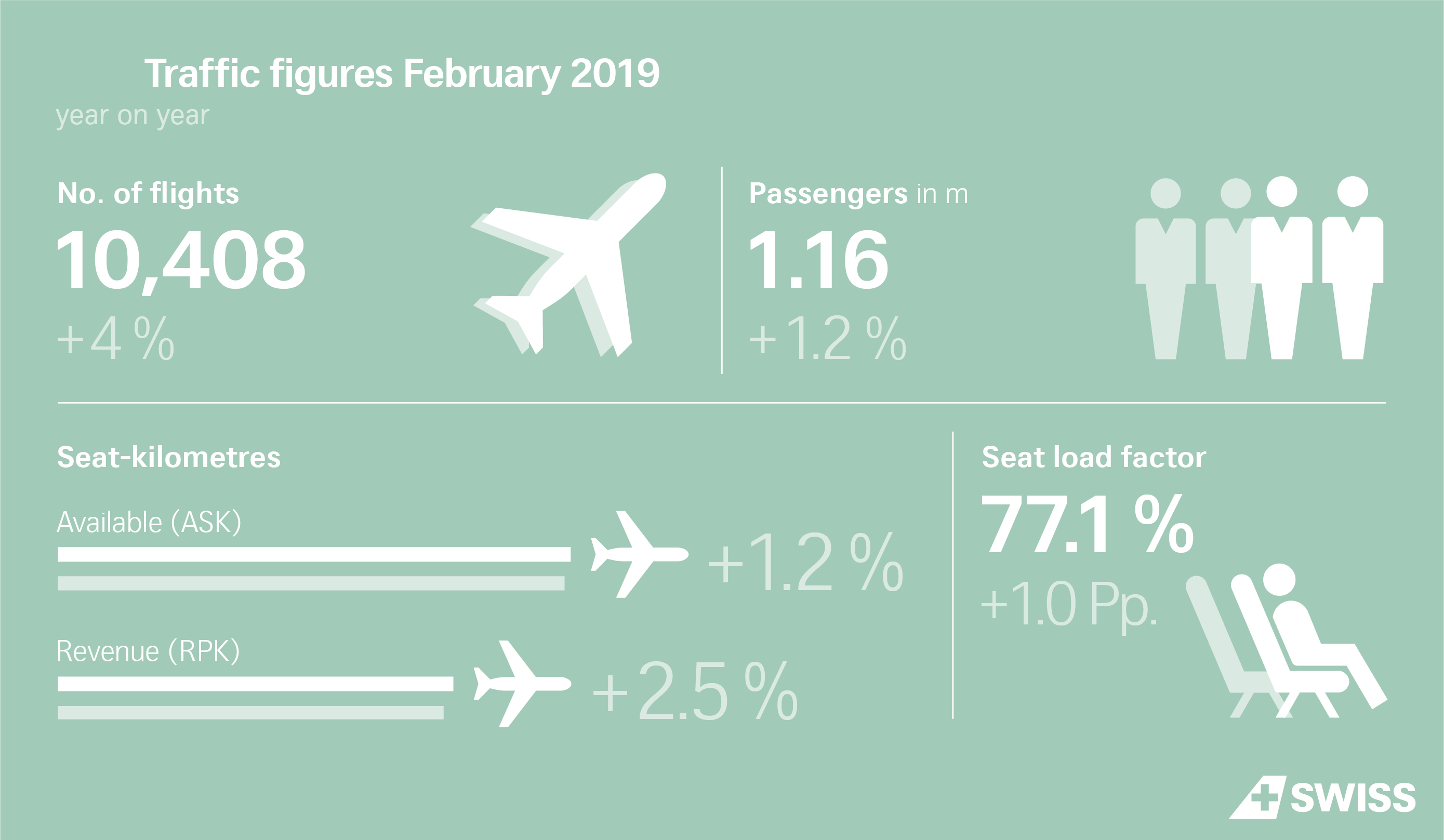 Η Swiss International Air Lines μετέφερε 1,157,740 επιβάτες τον Φεβρουάριο, σημειώνοντας αύξηση 1,2%, σε σχέση με τον ίδιο μήνα πέρυσι. Κατά τη διάρκεια του μήνα έγιναν συνολικά 10.408 πτήσεις, αριθμός ο οποίος ανέβηκε κατά 4,0% σε σχέση με τον Φεβρουάριο του 2018.