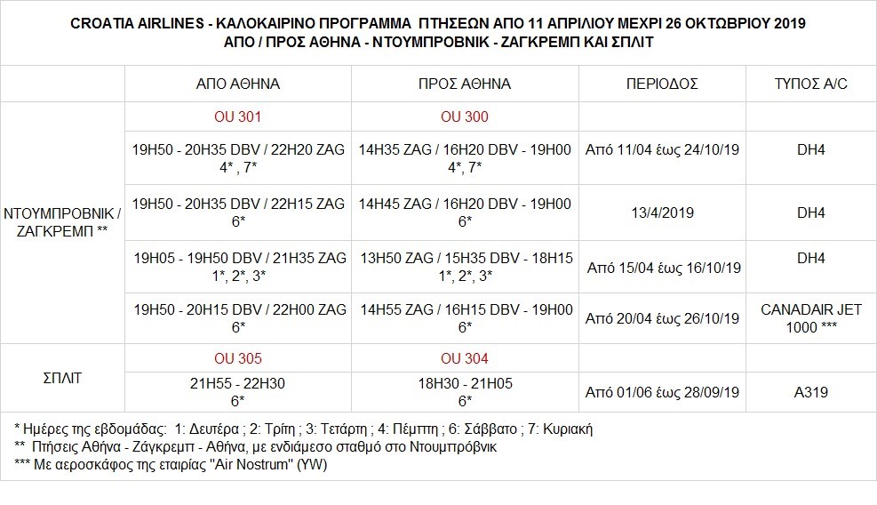 Η Croatia Airlines ξεκινάει για άλλη μια χρονιά τις πτήσεις της από και προς την Αθήνα, για τη θερινή περίοδο. Συγκεκριμένα, από τις 11 Απριλίου μέχρι τις 26 Οκτωβρίου 2019,  θα συνδέει την Αθήνα με το Ντουμπρόβνικ και το Ζάγκρεμπ καθημερινά εκτός Παρασκευής και από την 1η Ιουνίου μέχρι τις 28 Σεπτεμβρίου 2019 θα αναχωρεί απευθείας πτήση από την Αθήνα προς το Σπλιτ κάθε Σάββατο.