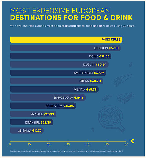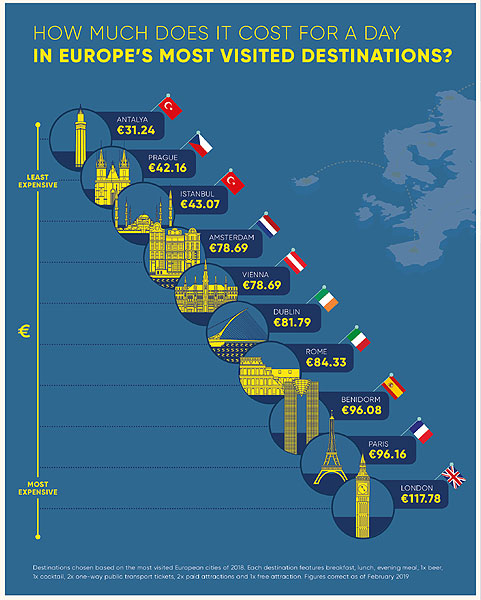 Το Λονδίνο λοιπόν είναι μία από τις πιο ακριβές πόλεις, για επίσκεψη με ημερήσιο προϋπολογισμό 50 ευρώ, ενώ η Αττάλεια βρίσκεται στην κορυφή ως ο φθηνότερος προορισμός.