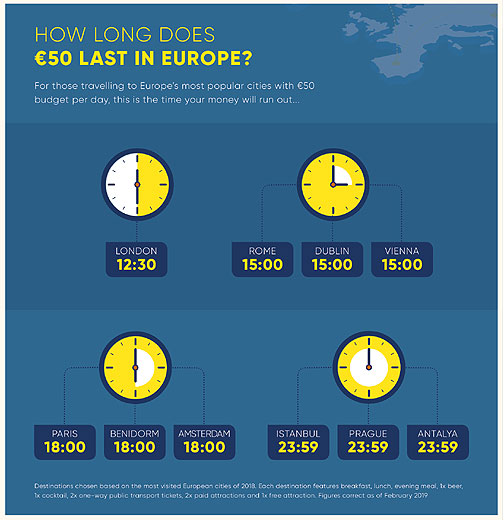 Ο ιρλανδικός ΟΤΑ Alpharooms Ireland ανέλυσε πρόσφατα τους πιο δημοφιλείς προορισμούς στην Ευρώπη, προκειμένου να εξετάσουν πόσες ώρες θα μπορέσει να «περάσει» ένας ταξιδιώτης σε κάθε πόλη με 50 ευρώ.