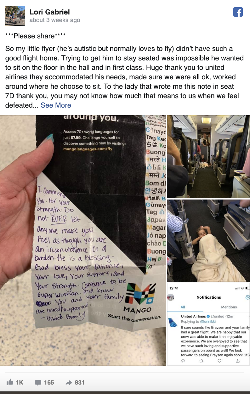 Η Gabriel ανέβασε το σημείωμα στο Facebook μαζί με μια φωτογραφία του Braysen από την πτήση, εκφράζοντας την ευγνωμοσύνη της στην εταιρεία. Η United απάντησε αμέσως, λέγοντας μεταξύ άλλων ότι ανυπομονούν να ξαναδούν τον Braysen σε κάποια πτήση τους.