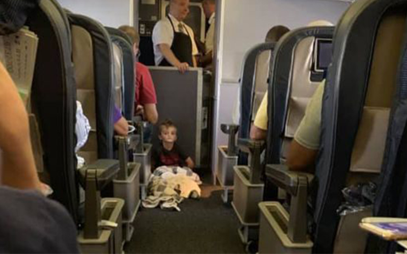 Κάποια στιγμή, το παιδί κλώτσησε μια επιβάτιδα που καθόταν απέναντι, μία αεροσυνοδό, η οποία ήταν εκτός υπηρεσίας σε εκείνη την πτήση, με την μητέρα να εξηγεί ότι ήταν πολύ καλή και τους έλεγε ότι δεν πειράζει, εάν το αγόρι κλωτσούσε τα πόδια της.