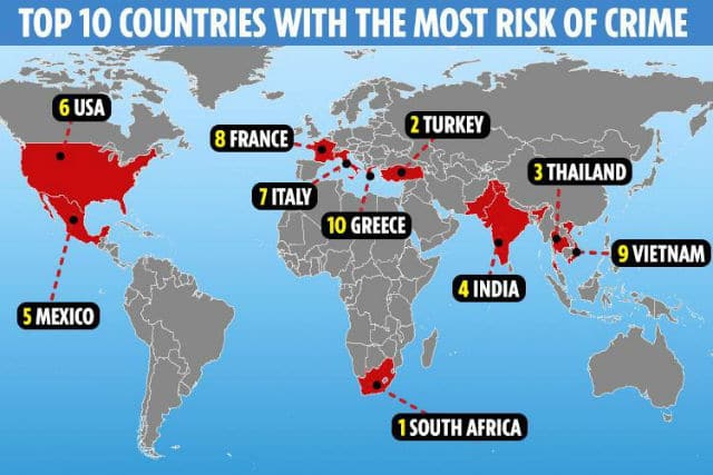 Η Ελλάδα ήταν στο Top 10 των χωρών με τη μεγαλύτερη εγκληματικότητα, όπου διαχρονικά η πρώτη θέση ανήκει στη Νότια Αφρική. Όσο για την Ελλάδα, εκείνη βρίσκεται στη 10η θέση (τελευταία δηλαδή), οπότε αυτός δεν είναι ο κύριος λόγος που απομακρύνει τους τουρίστες.