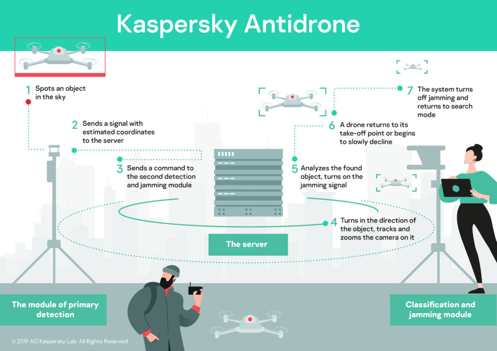 Το λογισμικό Kaspersky Antidrone, συντονίζει το έργο αρκετών hardware που παρέχονται από συνεργάτες και διακρίνει τα drones από άλλα αντικείμενα. Η κύρια μονάδα ανίχνευσης αναζητά drones που χρησιμοποιούν βιντεοκάμερες σε συνδυασμό με ραντάρ, LIDAR και αισθητήρες ήχου – ανάλογα με τις ανάγκες και το περιβάλλον. Χρησιμοποιώντας ένα σαρωτή λέιζερ για να προσδιορίσει τη θέση του drone, η λύση που προσφέρει η Kaspersky αποτελεί τη μοναδική στο είδος της, καθώς δεν έχει εφαρμοστεί ποτέ στο παρελθόν κάτι παρόμοιο.