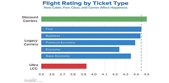 Το ποσοστό ικανοποίησης στους αερομεταφορείς με εκπτωτικούς ναύλους κυριαρχεί επί όλων των άλλων τύπων εισιτηρίων, συμπεριλαμβανομένης της First Class σε καταξιωμένες αεροπορικές εταιρείες και όλων των αερομεταφορέων χαμηλού κόστους.