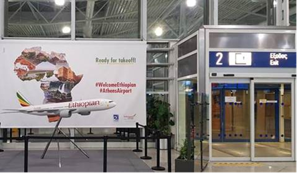 Ένα μεγάλο αεροπλάνο, μοντέλο της Ethiopian Airlines, περιμένει τους επιβάτες και τους επισκέπτες από 15 Ιανουαρίου έως και τις 14 Φεβρουαρίου 2020 τα μεσάνυχτα (23:59), στο επίπεδο των αναχωρήσεων, στην είσοδο 2 του αεροδρομίου.