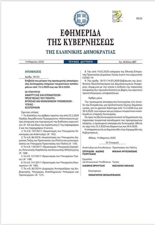 «Η προσωρινή απαγόρευση λειτουργίας στο σύνολο της Επικράτειας, για προληπτικούς λόγους δημόσιας υγείας, για το χρονικό διάστημα από 15.3.2020 έως και 30.4.2020, των κύριων και μη κύριων τουριστικών καταλυμάτων εποχικής λειτουργίας.