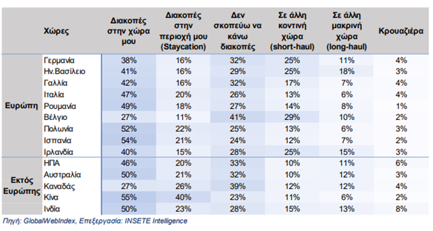 Ένα σημαντικό τμήμα του πληθυσμού, ανεξαρτήτως χώρας προέλευσης, εκτιμά πως τους επόμενους 12 μήνες θα πραγματοποιήσει είτε διακοπές στη χώρα του (27% έως 55%) είτε στην περιοχή του (staycations) (11% έως 40%), ενώ εξίσου μεγάλο είναι το μερίδιο αυτών που δεν σκοπεύουν να κάνουν διακοπές (από 23% έως 41%).