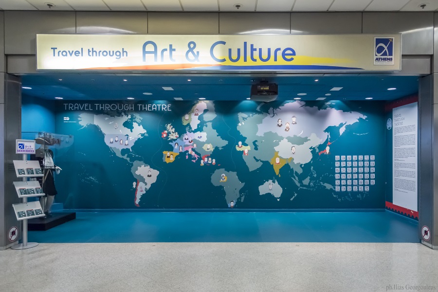 Στο επίπεδο των Αφίξεων, ένας «θεατρικός χάρτης» προσκαλεί τους επιβάτες και τους επισκέπτες του αεροδρομίου να εξερευνήσουν έναν κόσμο χωρίς σύνορα και χώρες, έναν κόσμο ανοιχτό που ενώνει ανθρώπους και πολιτισμούς. Ένας ενδεικτικός – και σε καμία περίπτωση εξαντλητικός – θεατρικός χάρτης με επιδραστικούς συγγραφείς, τους οποίους μπορούμε να γνωρίσουμε καλύτερα μέσω qrcodes που αποκαλύπτουν στοιχεία για τη ζωή και τη δραματουργία τους, φωτογραφίες από παραστάσεις των έργων τους στο Εθνικό Θέατρο της Ελλάδας, αλλά και θησαυρίσματα από τα κείμενά τους.
