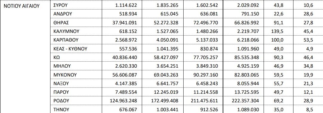 Οι αυξήσεις των δύο αυτών νησιών έναντι των ίδιων μηνών του 2021 ήταν για μεν τη Σαντορίνη 91,1% και 27,8% αντίστοιχα και για τη Μύκονο 59,5% και 19,9%.