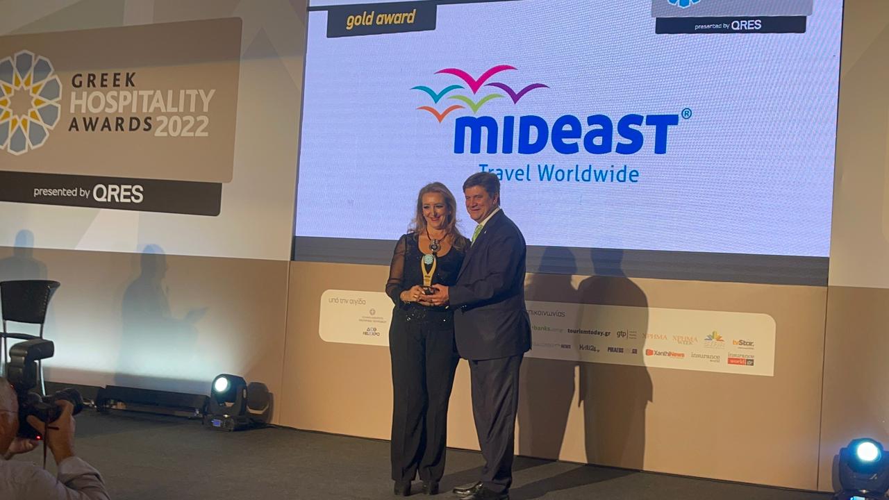 Με το Gold Award στην κατηγορία Best VIP & Luxury Travel Services διακρίθηκε η Mideast Travel Worldwide στα Greek Hospitality Awards 2022, τα βραβεία θεσμός που επιβραβεύουν τις καλύτερες επιχειρήσεις στον Ελληνικό τουριστικό κλάδο. Η διάκριση αυτή αποτελεί μια σημαντική αναγνώριση της Mideast για την παροχή Πολυτελών υπηρεσιών παγκοσμίως και έρχεται να συμπληρώσει, με μία ακόμη βράβευση, την πολυετή πορεία διακρίσεων της εταιρείας, στον τουριστικό κλάδο.