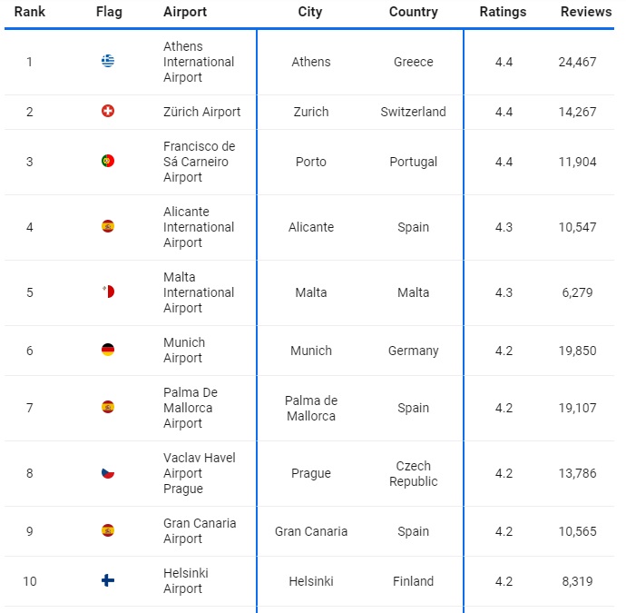 Αξίζει να σημειωθεί ότι στην 11η θέση με βαθμολογία 4,2 αστέρια, βρίσκεται το αεροδρόμιο «Μακεδονία» της Θεσσαλονίκης.