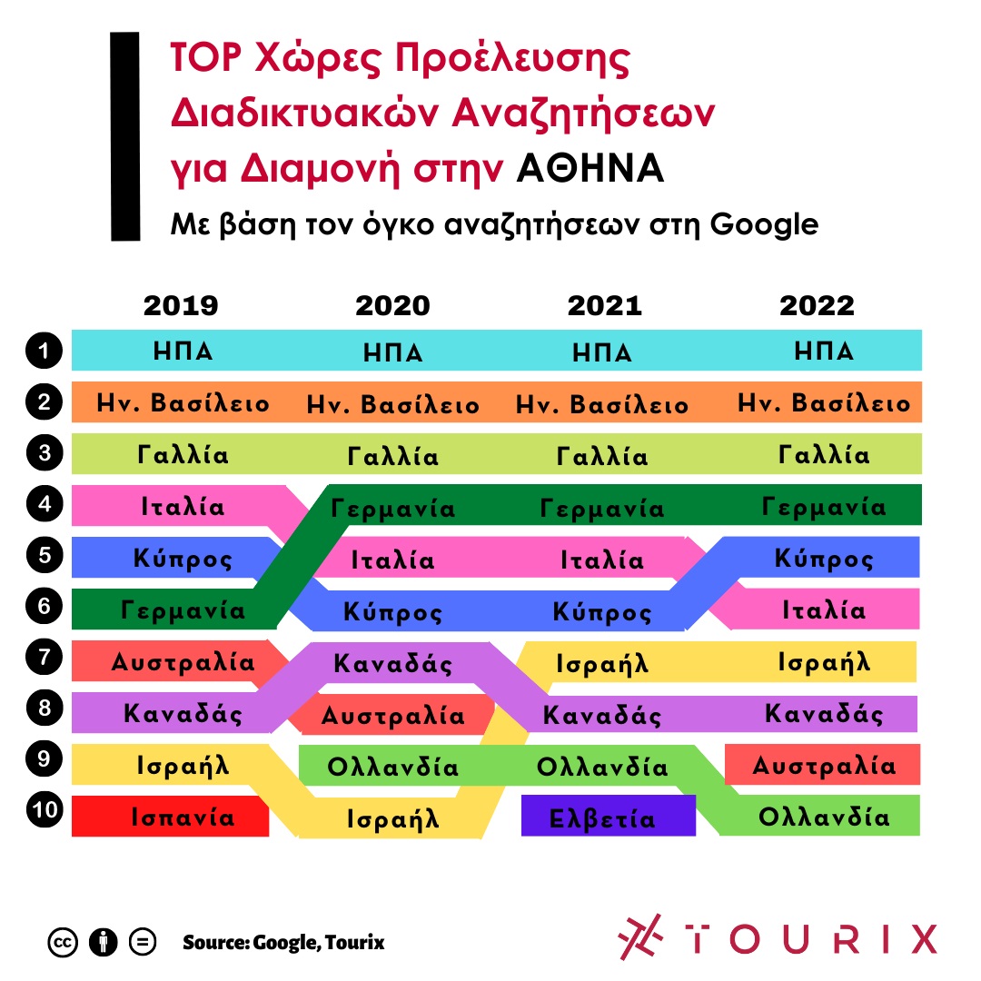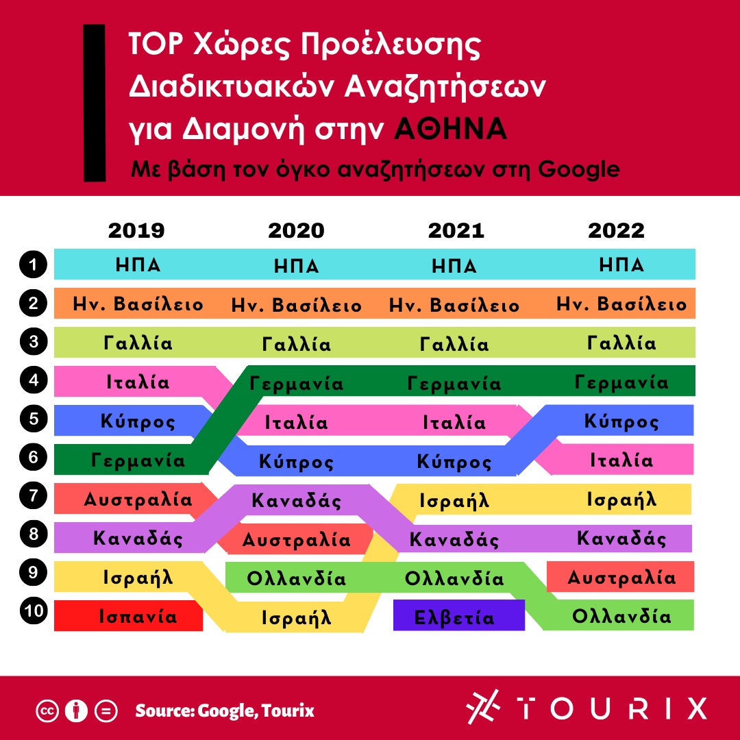 Οι κορυφαίες χώρες σε επίπεδο αναζητήσεων για διαμονή στην Αθήνα για το 2022 ήταν οι ΗΠΑ και το Ηνωμένο Βασίλειο, ακολουθούν με σημαντική διαφορά η Γαλλία, η Γερμανία και η Κύπρος. Σημαντικές είναι και οι αγορές-χώρες που συμπληρώνουν τη δωδεκάδα που είναι η Ιταλία, το Ισραήλ, ο Καναδάς, η Αυστραλία, η Ολλανδία, η Ισπανία και η Ελβετία.