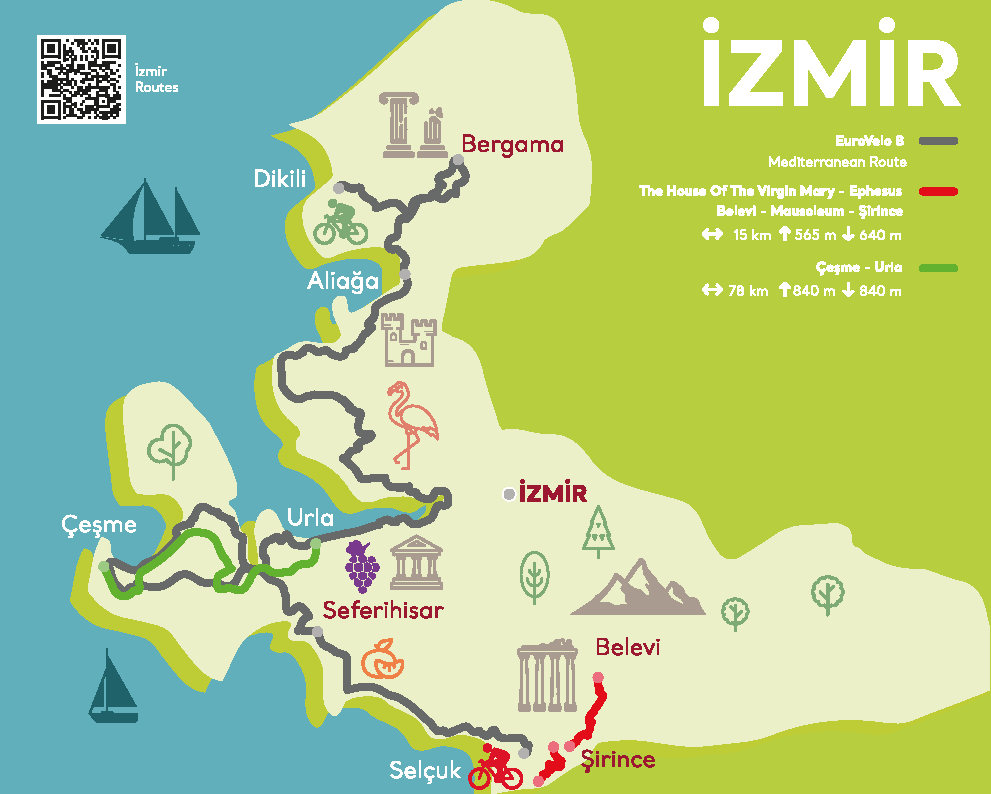 Το Συνέδριο EuroVelo & ποδηλατικός τουρισμός, που διοργανώνεται ανά δύο έτη σε διαφορετική χώρα από το 2012, φέτος διοργανώνεται για πρώτη φορά στη Σμύρνη, την πρώτη πόλη της Τουρκίας που επιλέχθηκε να φιλοξενήσει την εκδήλωση και είναι μέρος του δικτύου EuroVelo 8-Μεσογειακή διαδρομή. Το συνέδριο θα διοργανωθεί υπό την αιγίδα του υπουργείου Πολιτισμού και Τουρισμού της Τουρκίας, του τουρκικού Οργανισμού Προώθησης και Ανάπτυξης του Τουρισμού (TGA) και της Ευρωπαϊκής Ομοσπονδίας Ποδηλατιστών (ECF) σε συνεργασία με τοπικούς φορείς και με το Μητροπολιτικό Δήμο Σμύρνης. Η διαδρομή EuroVelo 8, η οποία ξεκινά από την περιοχή της Ανδαλουσίας, συνδέει τα μεσογειακά παράλια της Γαλλίας, της Ιταλίας και της Βαλκανικής χερσονήσου με την Τουρκία μέσω μιας διαδρομής που περνά από το Δεκελί (Dikili), την Πέργαμο (Bergama), το Αλιαγά (Aliağa), τη Φότσα (Foça), τη Σμύρνη (İzmir), το Μπαλικλιόβα (Balıklıova), τα Αλάτσατα (Alaçatı), το Τσεσμέ Σιγιατζίκ (Çeşme Sığacık) και το Σελτσούκ (Selçuk). Υπάρχουν δύο εμβληματικά αξιοθέατα του Καταλόγου Μνημείων Πολιτισμικής Κληρονομιάς της UNESCO (Έφεσος και Πέργαμος) στον τομέα της Σμύρνης του EuroVelo 8.