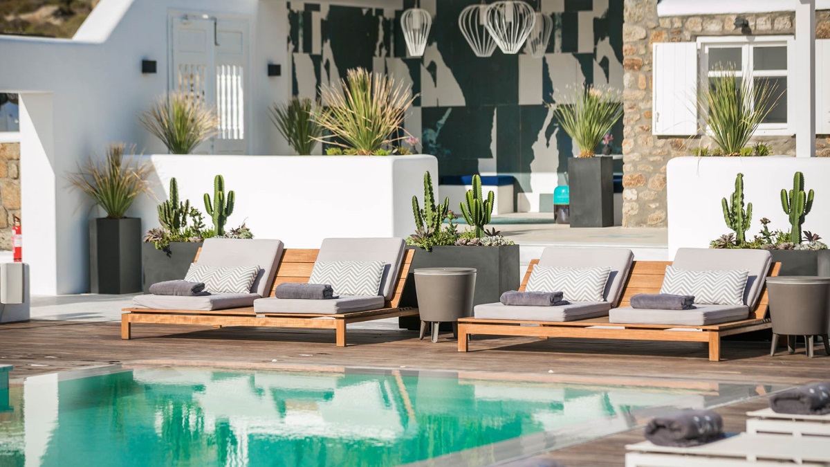 H κυκλαδίτικη αισθητική κυριαρχεί στους εσωτερικούς χώρους, με πέτρινους τοίχους, ήρεμους χρωματικούς τόνους, χειροποίητα ξύλινα έπιπλα και φυσικά διακοσμητικά υλικά. Τα δωμάτιά του χαρακτηρίζει η χαρακτηριστική λιτή γοητεία, ενώ όλα διαθέτουν είτε πισίνα με θέα στη θάλασσα είτε υδρομασάζ. Το ξενοδοχείο έχει επίσης το δικό του εστιατόριο, wellness room, υπαίθριο γυμναστήριο και πισίνα.