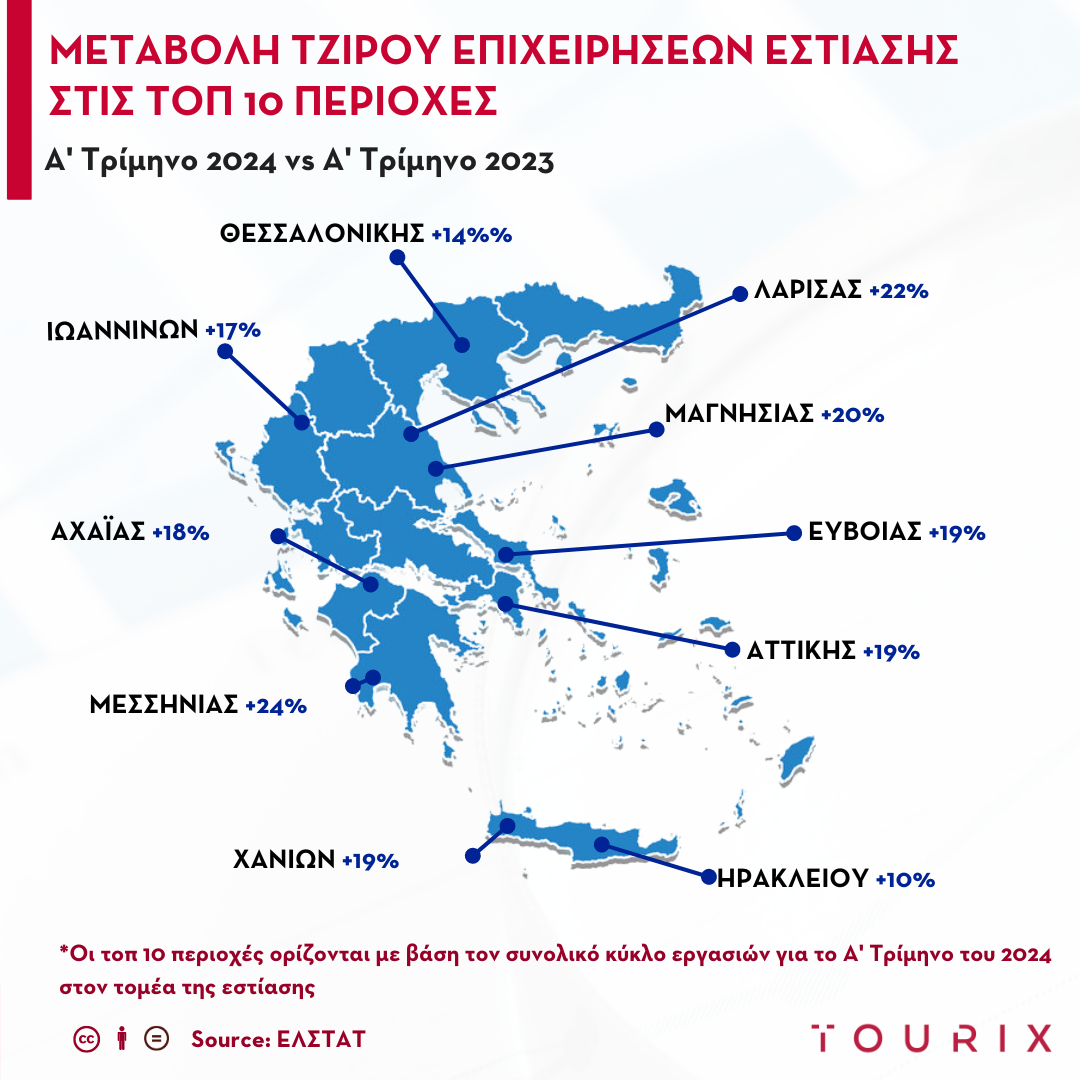 Οι επιχειρήσεις εστίασης της Χαλκιδικής σημείωσαν μια σημαντική επίδοση, φτάνοντας το τζίρο των 11,9 εκ. ευρώ για την περίοδο Ιανουαρίου – Μαρτίου 2024 (αύξηση 28% συγκριτικά με το 2023). Σημαντική αύξηση παρουσίασε και η Πιερία (19%).