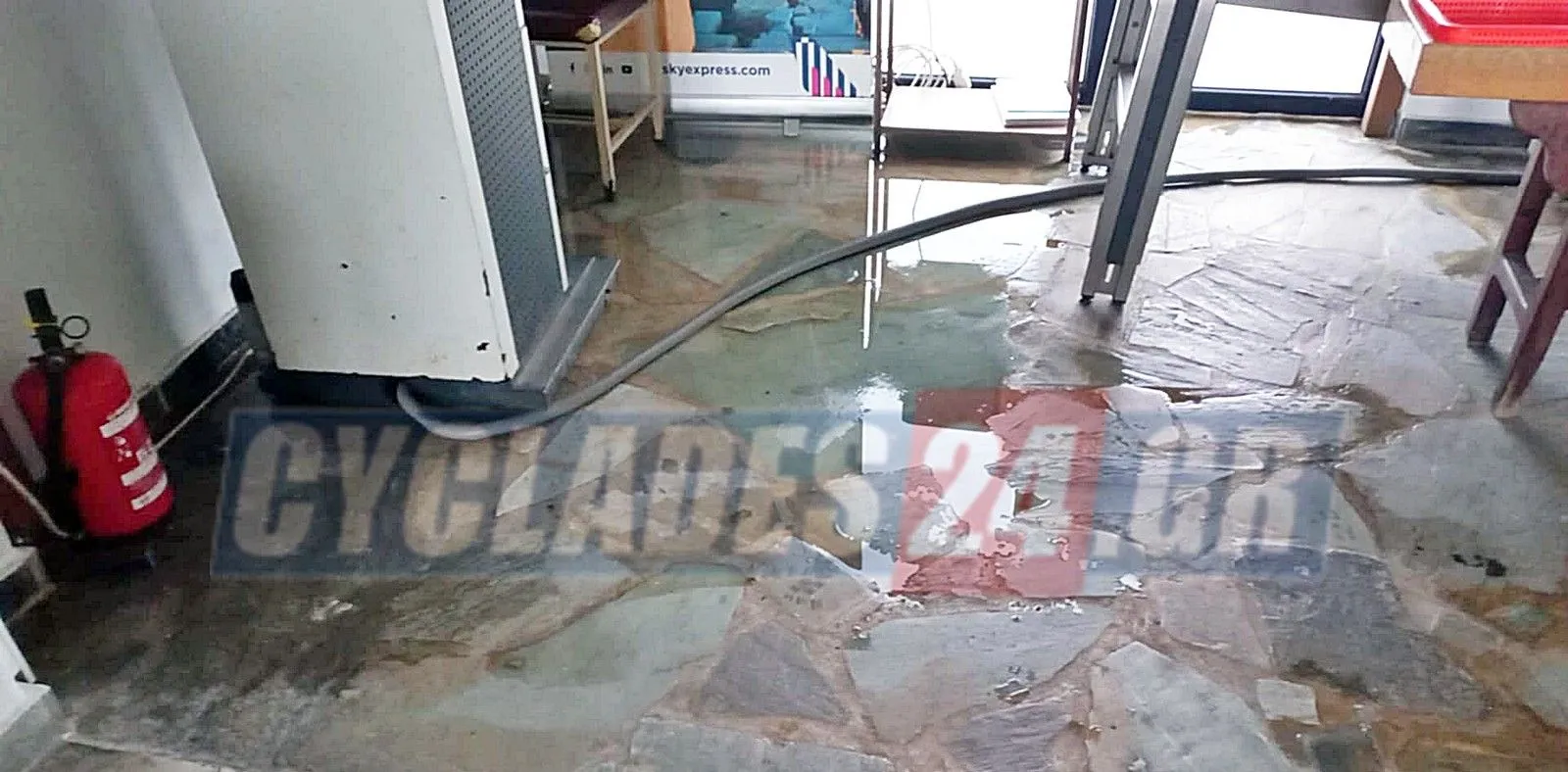 Οι εγκαταστάσεις του κρατικού αερολιμένα Νάξου “υπέφεραν” αυτό το διάστημα από την κακοκαιρία, με αποτέλεσμα να πλημμυρίσει ο χώρος ελέγχου των χειραποσκευών. Οπως φαίνεται και στις φωτογραφίες που εξασφάλισε το τοπικό μέσο cyclades24.gr, κάτω από το X-Ray υπάρχουν αρκετά νερά, με ένα ups να βρίσκεται εκτεθειμένο στον κίνδυνο ηλεκτροπληξίας. Στην ίδια μοίρα βρίσκεται και το μηχάνημα ανίχνευσης μεταλλικών αντικειμένων, όπου περνούν οι επιβάτες, προκειμένου να επιβιβαστούν στο αεροπλάνο.
